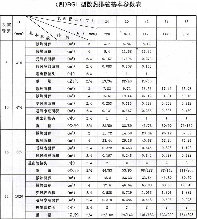 BGL型蒸汽散热器,可分二排、四排、六排,当然也能制单排,以及其他非标形式,每种型号均有大小不同的规格,在此只标常规型号、规格。其中外壳、无缝不锈钢管¢18×2m/m均用1Cr18Ni9Ti材料,其翅片管用铝轧制而成,翅片管外径为¢38mm,根径为¢19mm,其片高为9.5mm,片距为R片(3m/m),翅片管呈螺旋状。